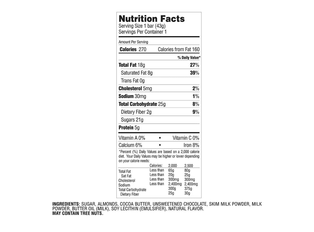 Ingredients: Sugar, Almonds, Cocoa Butter, Unsweetened Chocolate, Skim Milk Powder, Milk Powder, Butter Oil (Milk), Soy Lecithin (Emulsifier), Natural Flavor. May contain Tree Nuts.