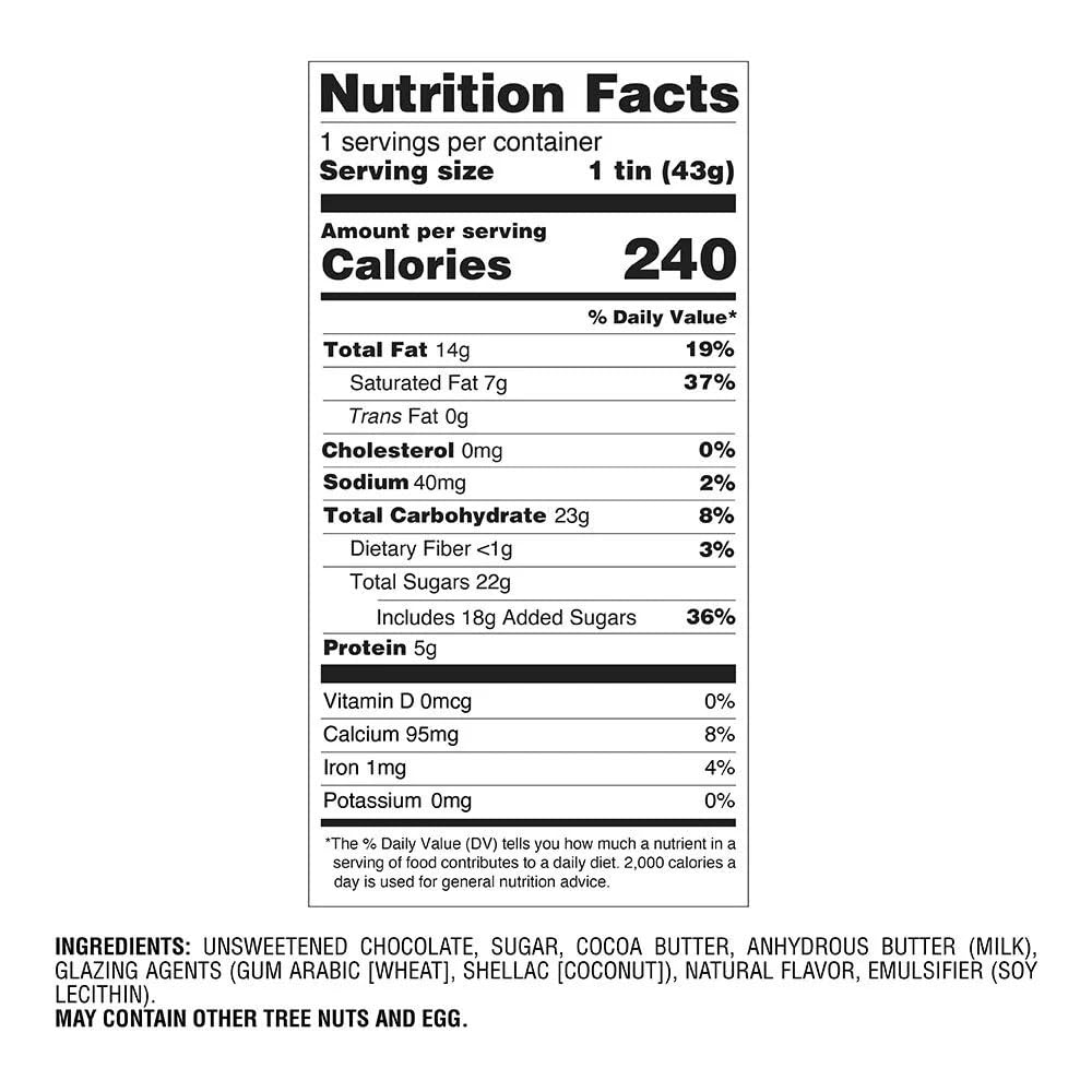 Ingredients: Unsweetened Chocolate, Sugar, Cocoa Butter, Anhydrous Butter (Milk), Glazing Agents (Gum Arabic [Wheat], Shellac [Coconut]), Natural Flavor, Emulsifier (Soy Lecithin). May contain other Tree Nuts and Egg.