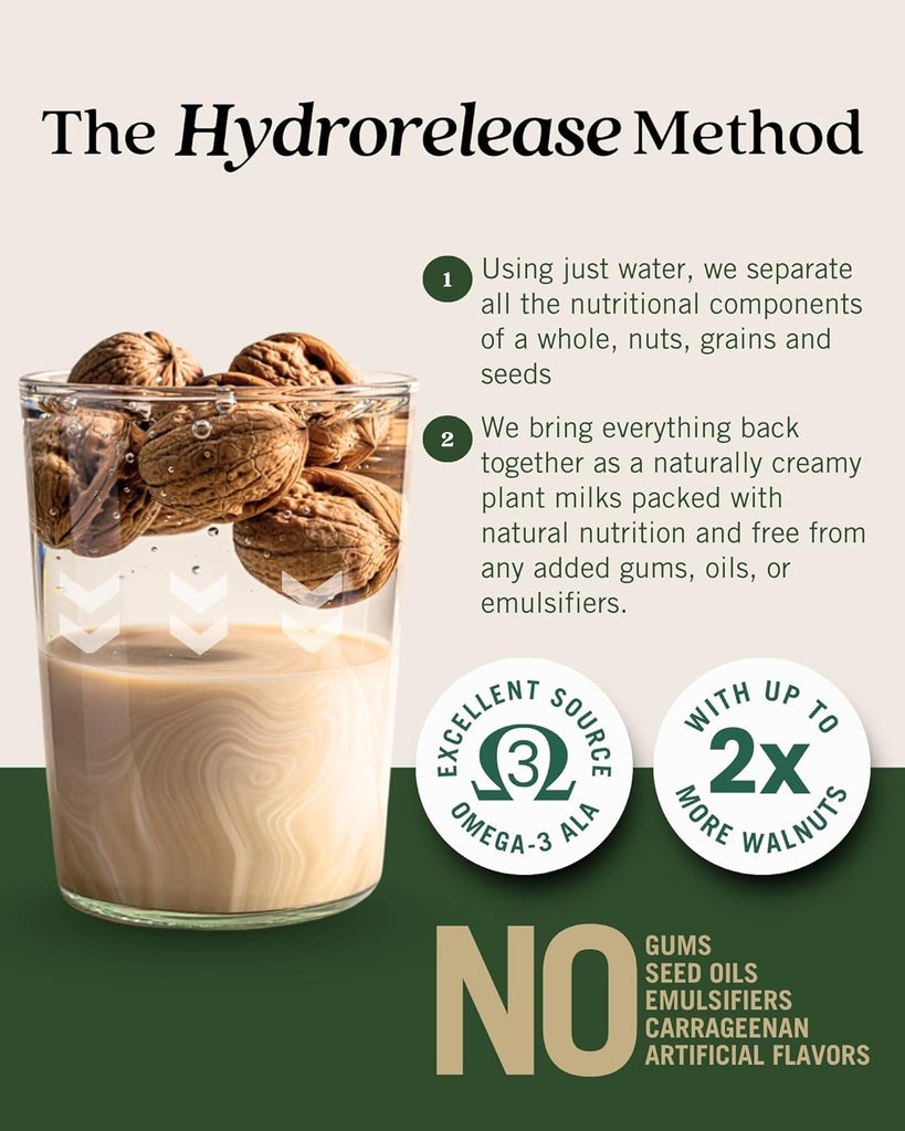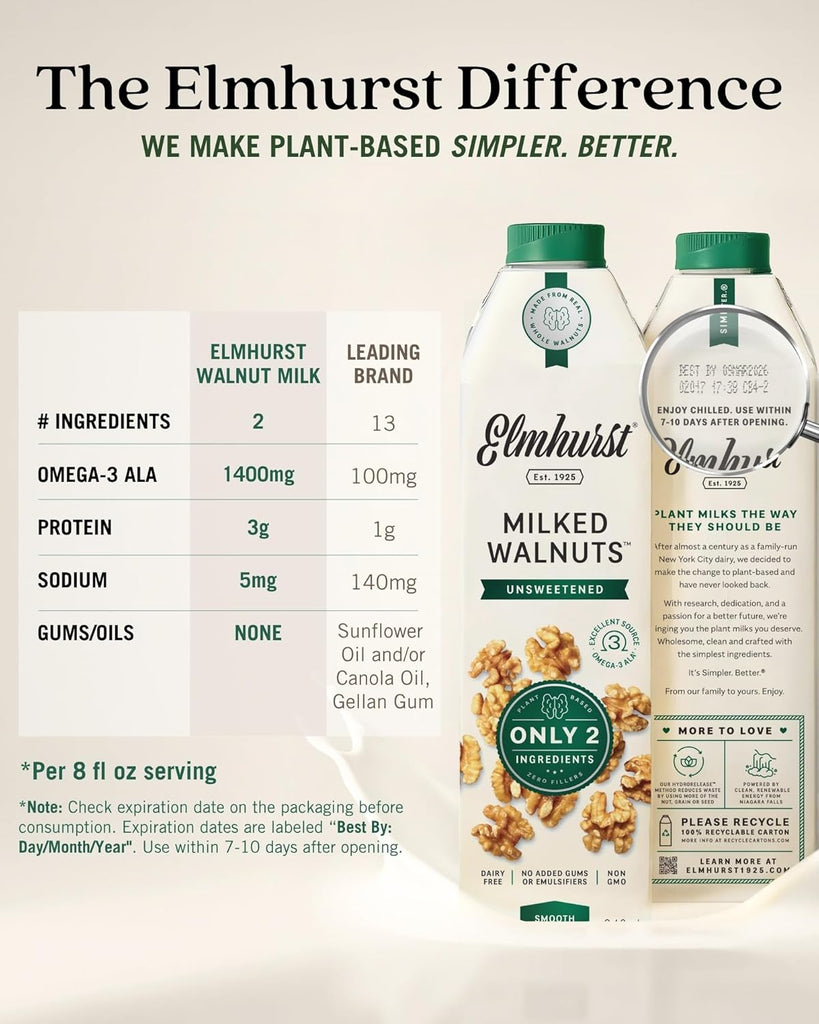 - PURE & SIMPLE INGREDIENTS: Made with just filtered water and walnuts, Elmhurst Walnut Milk is free from added sugars, gums, emulsifiers, and artificial flavors, promising a clean, wholesome taste. This simple formula ensures you enjoy the true flavor of almonds with every sip.