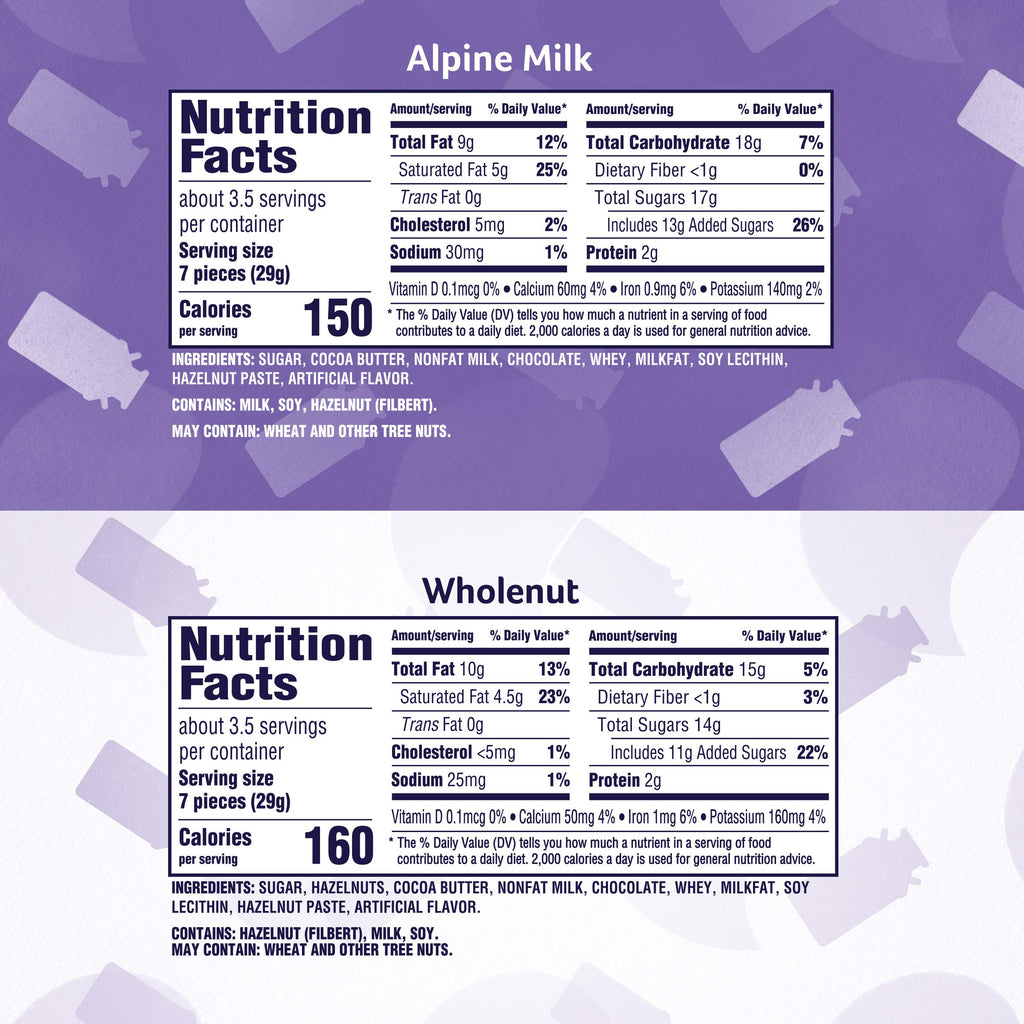 Alpine Milk Chocolate and Milka Wholenut Hazelnut Chocolate).