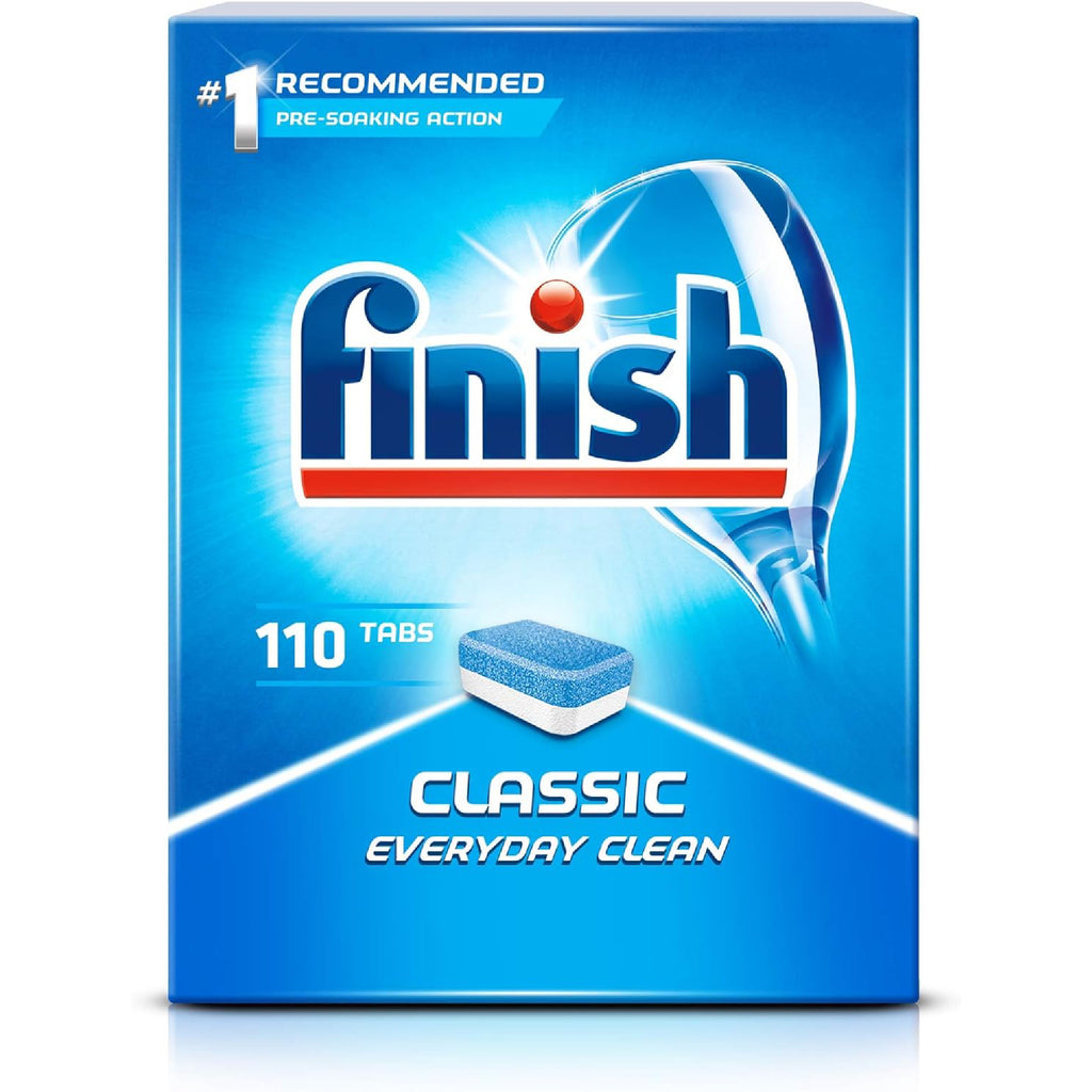 Finish classic dishwasher tablets contain active soft material that even soak toughest dirt, so they can be easily washed away. The powerful cleaner removes all kinds of food waste and ensures a shiny clean result. It is powerful cleaning and pre-soaking action. 100 percent so they keep their sparkling shine for longer and are protected wash after wash. For best results in short cycles, place finish all-in-one tablet on the floor of your dishwasher next to the filter. Available in 110 tablets. Directions: Unwrap one tablet and place into the dispenser for best results. If the tablet does not fit, consult the dishwasher manufacturer or manual for advice. Use Finish Salt and Finish Rinse Aid. Suitable for septic tanks. Usage Instructions: 1) Remove foods scraps and scrape plates and dishes. 2) Load dishes with soiled surfaces facing water spray. 3) Unwrap one tablet and place in the dry dispenser. For short cycles (30 minutes), If it does not fit in the dispenser or does not dissolve properly place in the bottom of the dishwasher. For a fisher & paykel dishdrawerÂ, place tablet in an empty section of the cutlery basket. 4) For best performance, use the "normal" wash cycle or a specialist tablet wash cycle. Suitable for most septic tanks, however refer to manufacturer of your waste water treatment system for septic advice. Finish Rinse Aid is recommended for best drying and shine results.