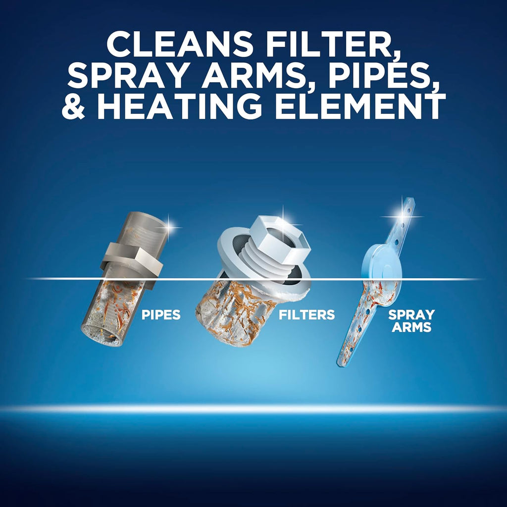 Finish dishwasher cleaner works by safely and effectively breaking down and removing mineral build-up inside your dishwashing machine, including hard-to-reach parts like the heating element and sprayer arms.