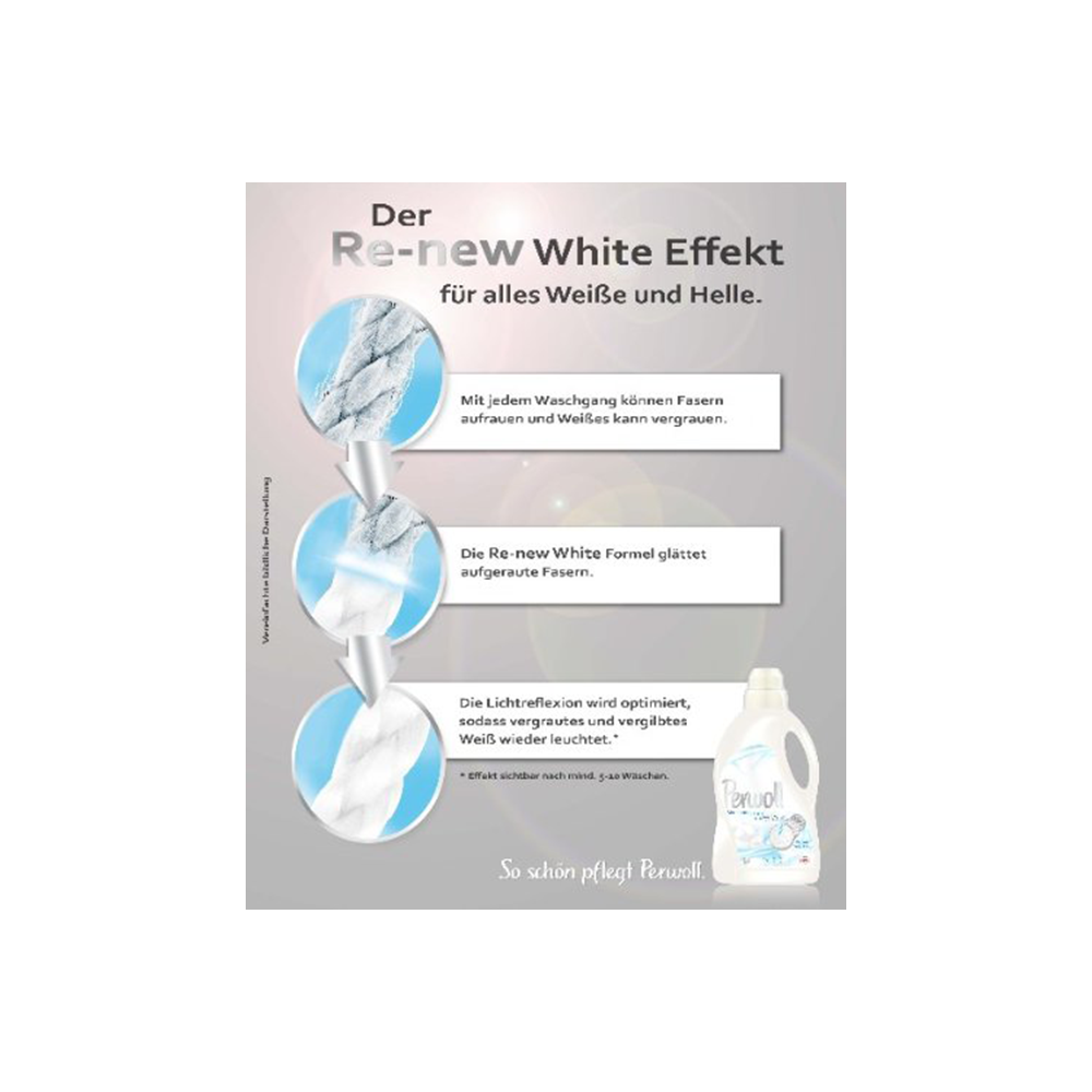- Perwoll Renew White - The liquid detergent provides optimal care for white textiles - it gives gentle cleanliness and refreshes white shades.