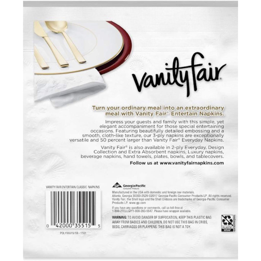 Vanity Fair Impressions 3-ply Napkins offer a luxurious, cloth-like feel for your dining experience. This pack includes 4 packs of 60 napkins, providing a total of 240 napkins for all your entertaining needs. Perfect for adding a touch of elegance to any occasion.