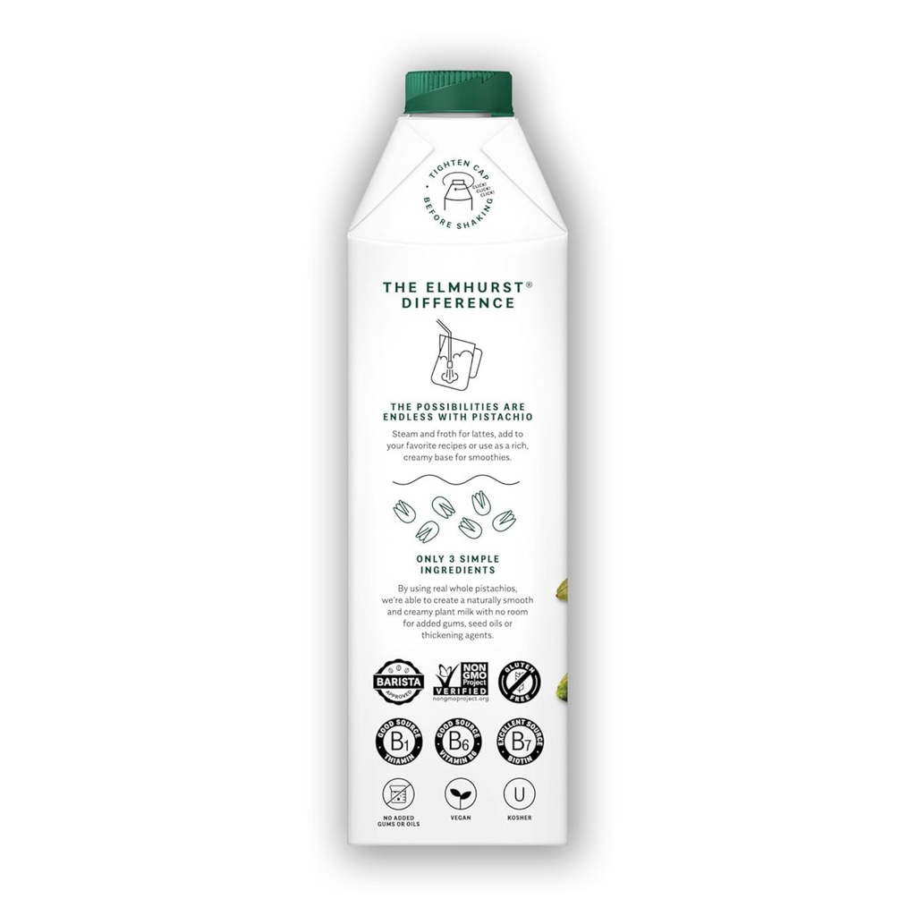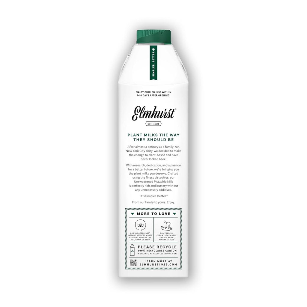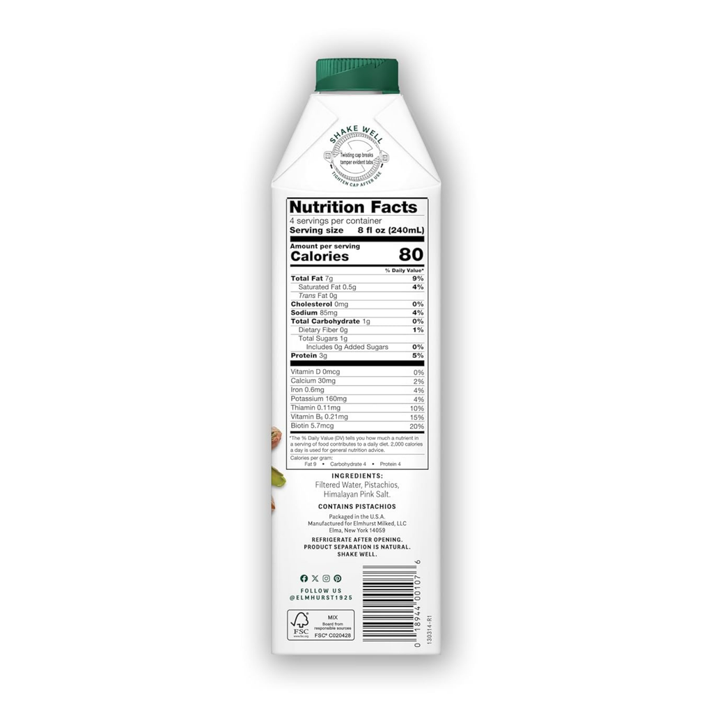 Elmhurst 1925 Unsweetened Pistachio Milk is a rich, creamy, and nutritious dairy-free milk made with just three simple ingredients—27 whole pistachios, water, and a pinch of Himalayan pink salt. This clean-label pistachio milk offers a smooth, nutty taste without any added sugars, artificial flavors, or unnecessary fillers, making it the thoughful addition to your plant-based lifestyle. Each serving provides 3g of natural plant protein, along with essential nutrients like biotin, thiamin, and Vitamin B6 to support your overall health. Elmhurst Pistachio Milk is vegan, dairy free gluten free, Non-GMO, and Kosher, ensuring it fits a variety of dietary preferences. Barista-approved, this unsweetened pistachio milk is great coffee creamers for creating creamy lattes, adding to smoothies, or incorporating into recipes. Its rich, velvety texture enhances the taste of your favorite drinks, whether hot or cold. Crafted with the innovative HydroRelease method, Elmhurst 1925 Unsweetened Pistachio Milk extracts natural nutrients from pistachios, providing a creamy, smooth texture without the need for added gums or emulsifiers. This method ensures you’re getting the purest and most flavorful nut milk possible. With recyclable cartons and a shelf-stable design, Elmhurst 1925 Unsweetened Pistachio Milk is a convenient choice that’s ready whenever you need it. Enjoy the simplicity of whole pistachios in every glass with this cleaner, better-tasting lactose free, nut-based alternative to dairy milk.