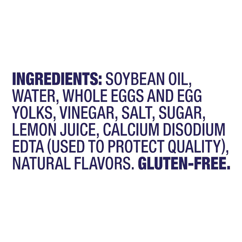 Ingredients: Soybean Oil, Water, Whole Eggs and Egg Yolks, Vinegar, Salt, Sugar, Lemon Juice, Calcium Disodium EDTA (Used to Protect Quality), Natural Flavors. Gluten Free. Made in USA by Unilever Food Solutions, Lisle IL 60532, USA.