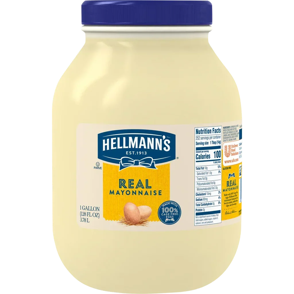 TL;DR: Hellmann's Real Mayonnaise in a 1-gallon foodservice jug. Made with 100% cage free eggs, gluten free, and Kosher (OU Pareve). 256 servings per container at 90 calories per tablespoon. Rich, creamy, and unmistakably Hellmann's — the #1 mayonnaise brand since 1913.