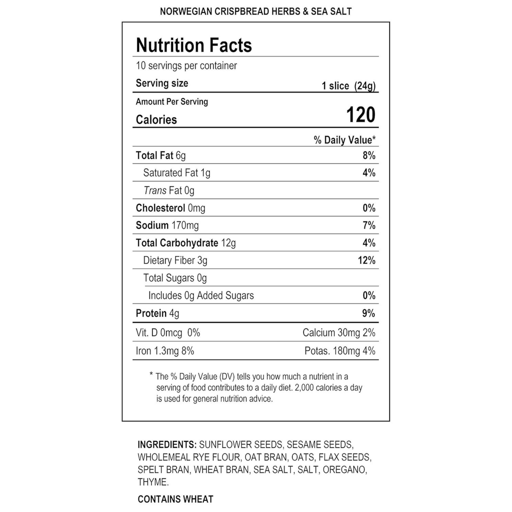 This crunchy crispbread contains several types of herbs including rosemary and thyme with a hint of sea salt. A wholegrain crispbread with only natural ingredients.