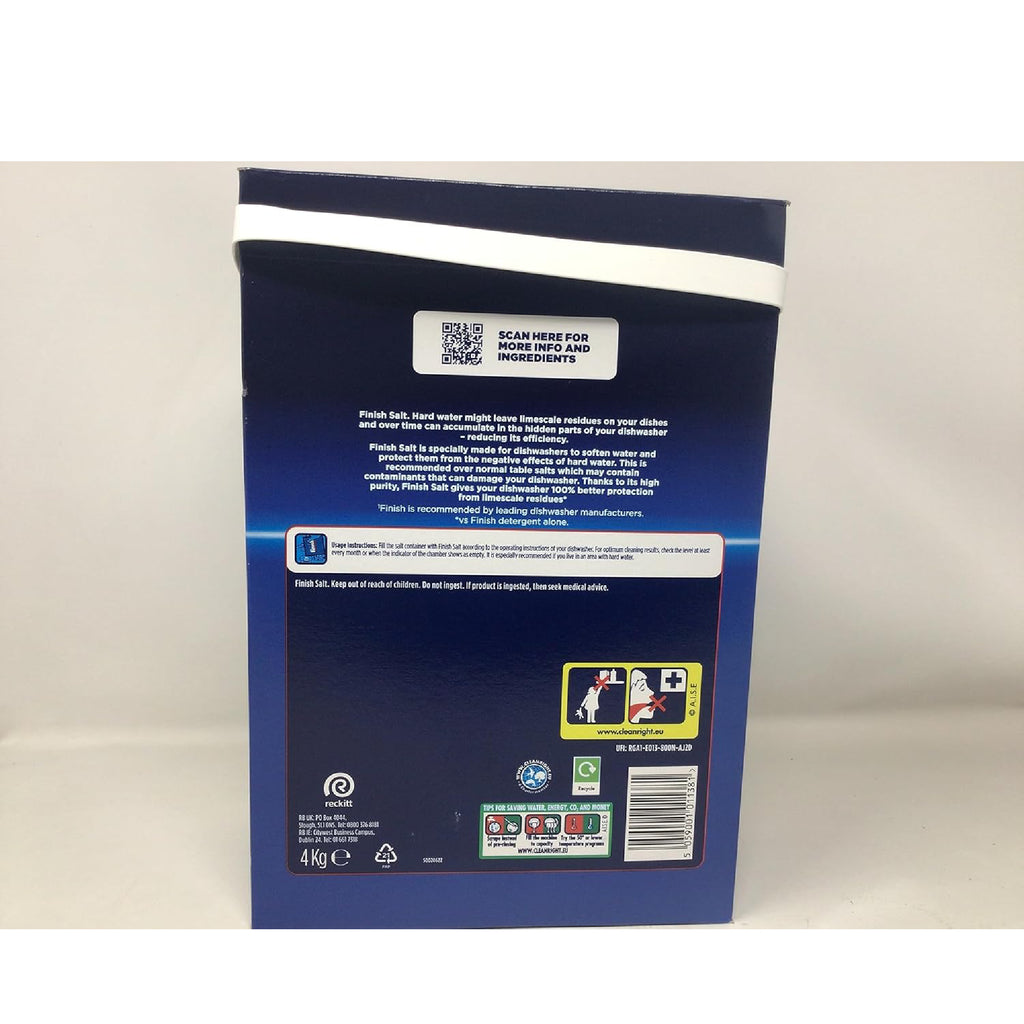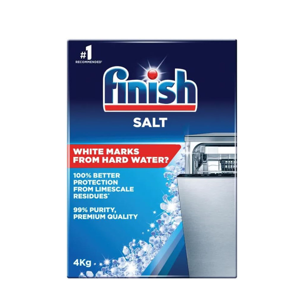 Finish Dishwasher Salt Bag 4kg. Designed to prevent limescale build up in the machine. Boosts dishwasher detergent performance. Prevents residue streaks and clouding on glasses and dishes. Ideal for use in hard water areas.