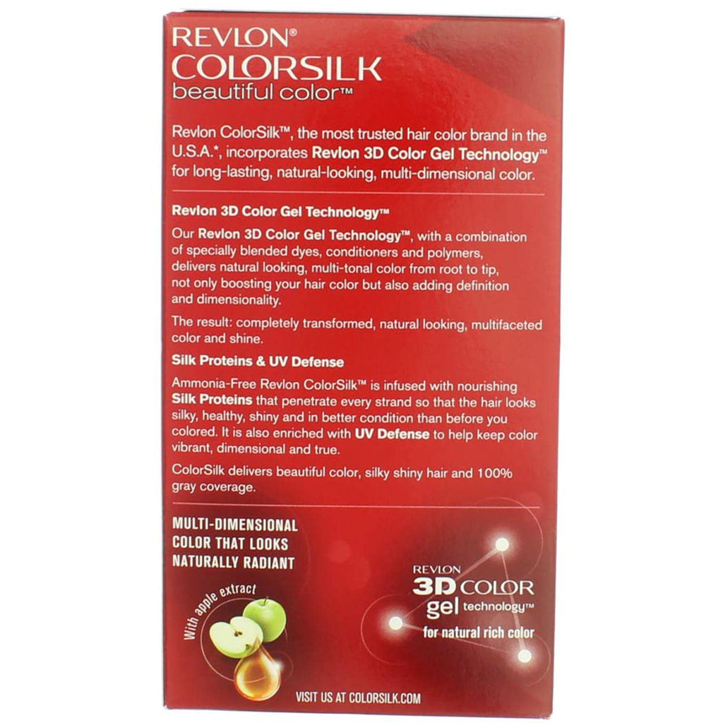 Revlon Colorsilk Radiant, long-lasting color. Leaves hair in better condition.Revlon Colorsilk gives you natural-looking, even color from root to tip that stays beautiful between colorings. It is formulated to penetrate every strand with its gentle, ammonia-free formula and after-color conditioner with nourishing silk proteins. Hair looks silkier, shinier and healthier than before you colored. 100% gray coverage. Leaves hair in better condition. Available in a range of 40 brilliant shadesColorsilk permanent haircolor can be used on natural, color-treated, relaxed or permed hair. TIPS: Watch the Revlon ColorSilk how-to video to learn how easy it is to get natural-looking, even color from root to tip.